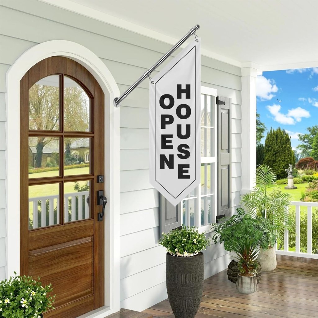Open House Wall Flag, Double-Sided Three-ply Hanging Open Sign with Pole and Mounting Kit (White-W)