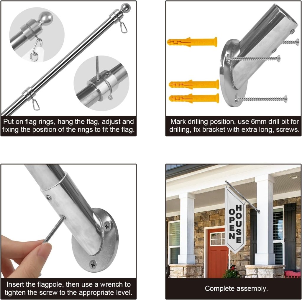 - Complete installation kit including: Each set open flags includes a stainless steel flagpole, open flag, pre-painted metal wall bracket, and mounting screws – ready to install out of the box