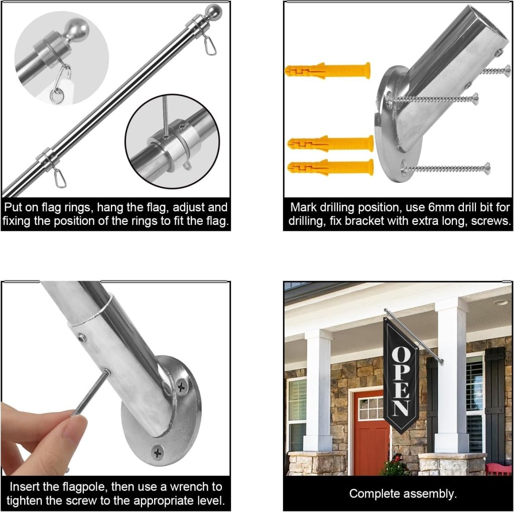 • Complete installation kit including: Each set open flags includes a stainless steel flagpole, open flag, pre-painted metal wall bracket, and mounting screws – ready to install out of the box